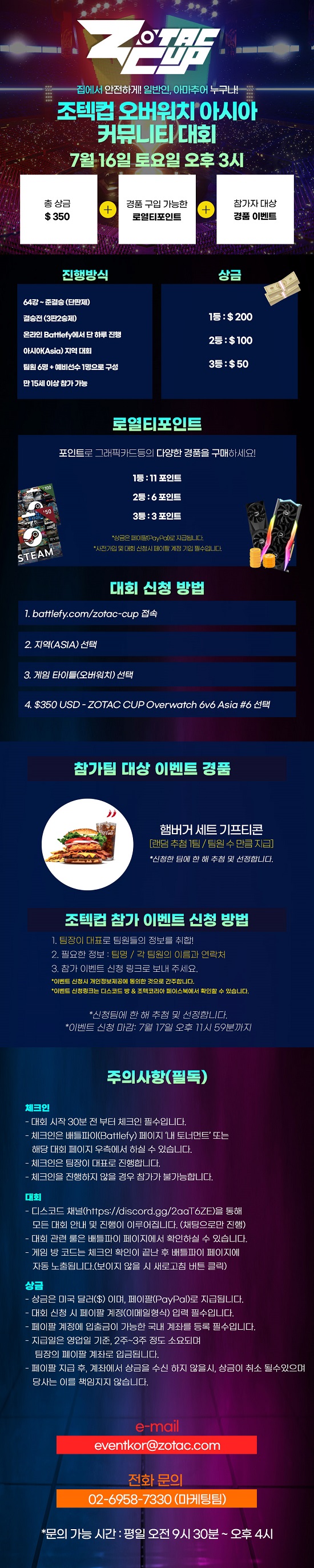 7월 16일 토요일 오후 3시 부터는 ‘조텍컵 오버워치 아시아 커뮤니티 대회’가 진행된다. 총 상금은 350달러 규모이며, 6 v 6 팀전 싱글 일리미네이션 방식으로 하루 동안 진행되며, 결승전과 3,4위 전만 BO3로 진행된다. 1등부터 3등까지 $200, $100, $50을 증정하며, 각각 승리 시에 조텍컵 포인트가 제공된다. 모은 포인트로는 스팀 기프트 카드부터 조텍 그래픽카드까지 다양한 경품과 교환 신청이 가능하다.
