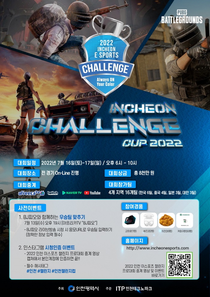 이번 ‘2022 인천 챌린지 컵’은 한국, 중국, 일본, 대만 4개 지역의 ‘배틀그라운드’ 프로팀들이 총상금 8천만 원을 걸고 대결을 펼친다.