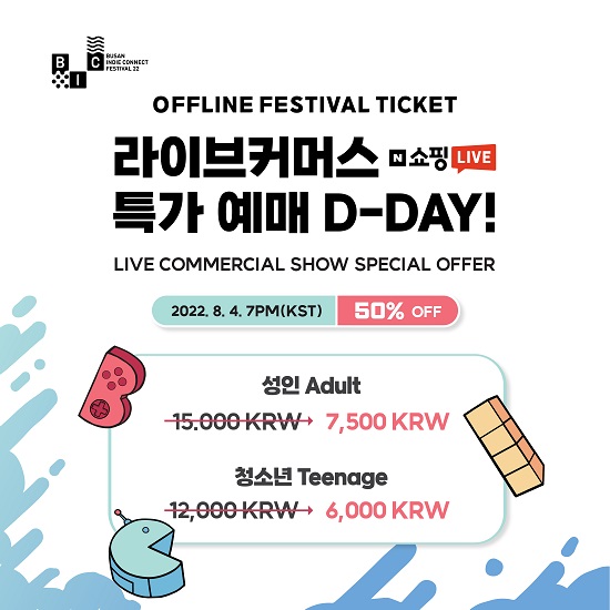 이날 예매 가능한 티켓은 9월 1일부터 4일까지 부산항국제전시컨벤션센터에서 진행되는 BIC 페스티벌 2022 기간 중 3일과 4일 진행되는 페스티벌 데이의 입장권이다. 해당 티켓은 네이버 쇼핑라이브 방송 시간 동안 정가의 50% 할인가로 구매 가능하며, 구매자는 양일간 오프라인 전시 및 부대 행사를 즐길 수 있다. BIC 페스티벌 2022는 게임 단독 행사로는 최초로 네이버 쇼핑라이브를 통해 예매를 진행하는 만큼 호텔 숙박권, 음료 교환권과 같은 다양한 상품 증정 이벤트도 진행할 예정이다. 또한 BIC와 깊은 인연을 가진 스페셜 MC의 등장이 예고되어 기대감을 모으고 있다.