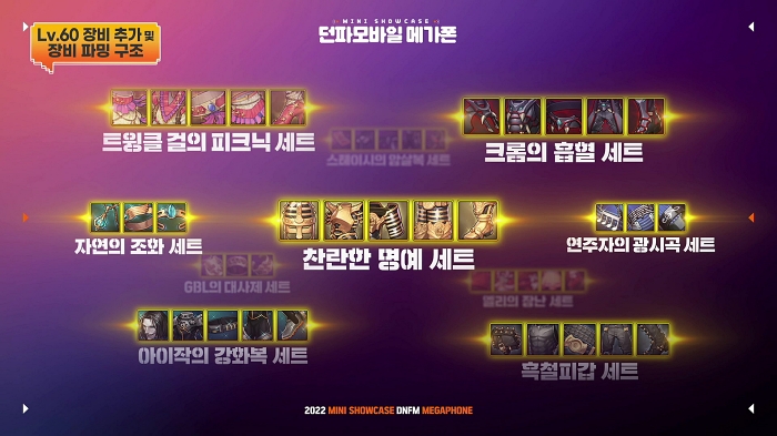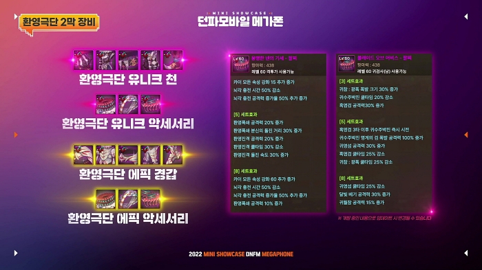 환영극단 2막 장비는 획득할 때는 기존과 동일하게 유니크 등급으로 얻지만 추후 에픽 등급으로 업그레이드할 수 있도록 계획하고 있다. 앞서 발표한 60레벨 에픽 장비 4세트와도 조합할 수 있어 캐릭터의 세팅 방향을 보다 폭넓게 가져갈 수 있다.