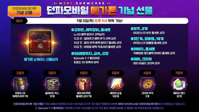 또한 추석 명절을 맞이해서 최대 레벨 확장을 준비하는 일환으로 남은 3주 동안 카드 합성 이벤트를 진행한다 유니크 카드를 확정으로 획득할 수 있는 이벤트로 계획되어 있다. 추석 선물로는 게임 내에서 출석이벤트 형식으로 강화된 에픽장비 풀세트, 에피소드 클리어권, 5단계 엠블렘, 아이리스의 보주 상자를 제공한다. 여기에 추가로 강림 로터스 레이드 초기화권까지 준비할 예정이다.