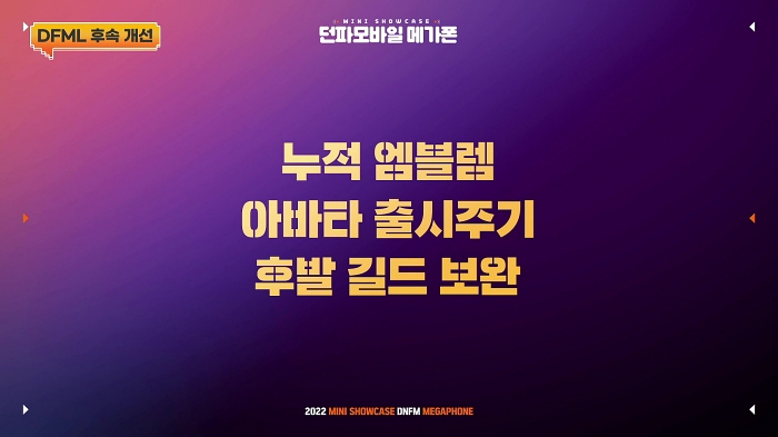 DFML과 함께 진행했던 첫 미니 쇼케이스에서 약속드린 내용 중 미뤄진 내용에 대해 사과하며 먼저 누적 엠블렘 시스템을 9월 29일에 업데이트할 예정이라 밝혔다. 누적 엠블렘 시스템으로 플래티넘 엠블렘 합성 시 원하는 엠블렘을 장기적으론 얻을 수 있게 하고, 아바타 출시 주기를 단축시킬 것이다.