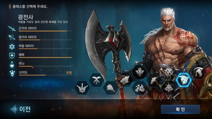 ‘광전사’는 기존의 ‘전사’ 클래스가 강력한 용인 ‘발라카스’의 힘을 얻었다는 스토리가 더해져 어둠을 가르는 힘과 도끼로 적을 압도하는 강인한 클래스다. 일정 거리 내의 적을 광전사 앞으로 이동시키고 이동과 텔레포트를 불가능하게 하는 ‘데스페라도’, 물약 사용 시 확률적으로 2개를 복용할 수 있는 ‘워리어(포션)’, 앞으로 돌진 후 충돌한 대상을 확률적으로 스턴 시키는 ‘차지’ 등의 스킬을 보유하고 있다. 강력한 체력을 바탕으로 적의 진영을 허물 수 있는 능력치와 스킬을 보유하여 전장의 선봉장으로 많은 사랑을 받고 있다.
