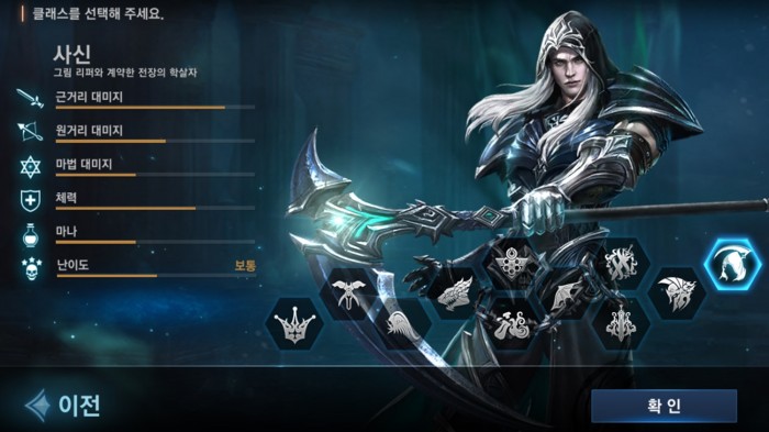 ‘사신’은 엘모어의 수호자이자 그림 리퍼와 계약한 전장의 학살자이다. 대상의 움직임을 막고 주변 캐릭터와 충돌을 무시해 돌진하는 ‘사이드 그랩’, 대상을 기절시키고 확률적으로 사신이 소환되어 잃은 체력에 비례한 추가 피해를 입히는 ‘데스 스턴’, 일정 범위 안에서 체력이 낮은 적을 감지해 자동으로 타겟을 지정하고 공격하는 ‘익스큐션’, 넓은 범위에 있는 최대 5인 NPC를 공격하는 ‘제노사이드’등 학살과 선고를 콘셉트로 한 스킬을 사용한다.