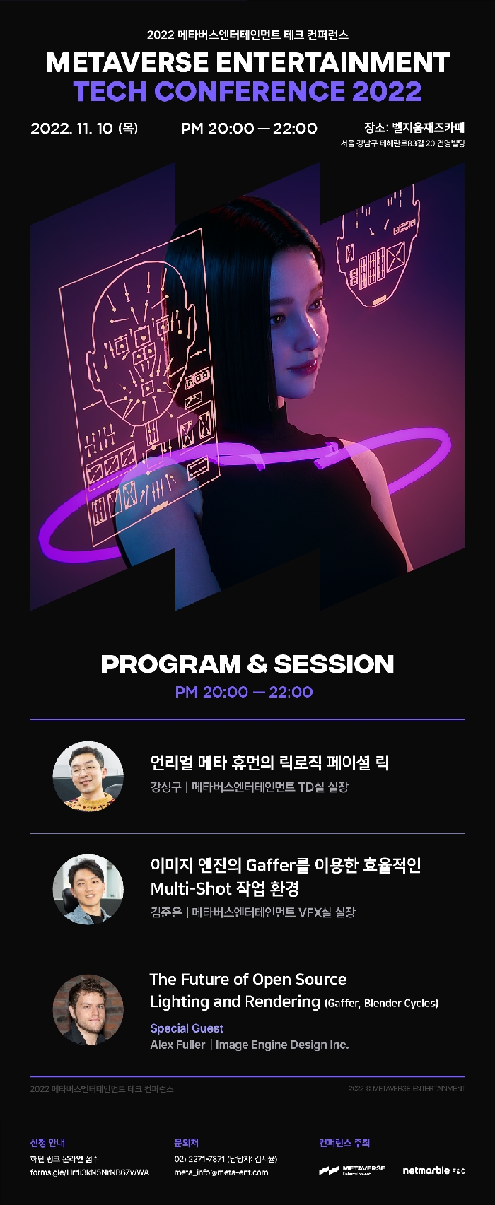 이번 컨퍼런스는 디지털 휴먼 제작, VFX에 관심 있는 사람이면 누구나 참여할 수 있으며, 참가 접수는 메타버스엔터테인먼트 페이스북 페이지를 통해 받는다.