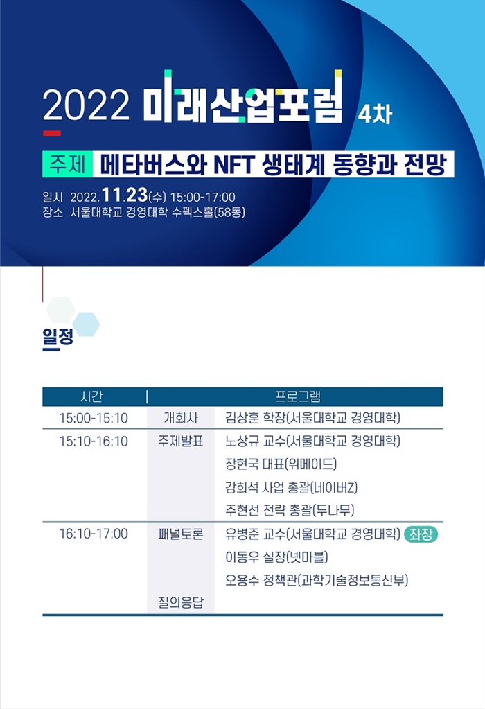 한편, 2022 미래산업포럼은 서울대학교 벤처경영기업가센터에서 주관하는 행사다. 4차 산업혁명 시대를 선도하고 창업 생태계를 이끌고 있는 주요 산업에 대해 발표와 토론을 진행한다. 올 6월부터 ‘디지털 자산거래와 가상화폐의 미래’, ‘온라인 플랫폼 생태계의 진화와 혁신’, ‘초거대 AI 생태계와 미래 방향’ 등을 주제로 열리고 있다.