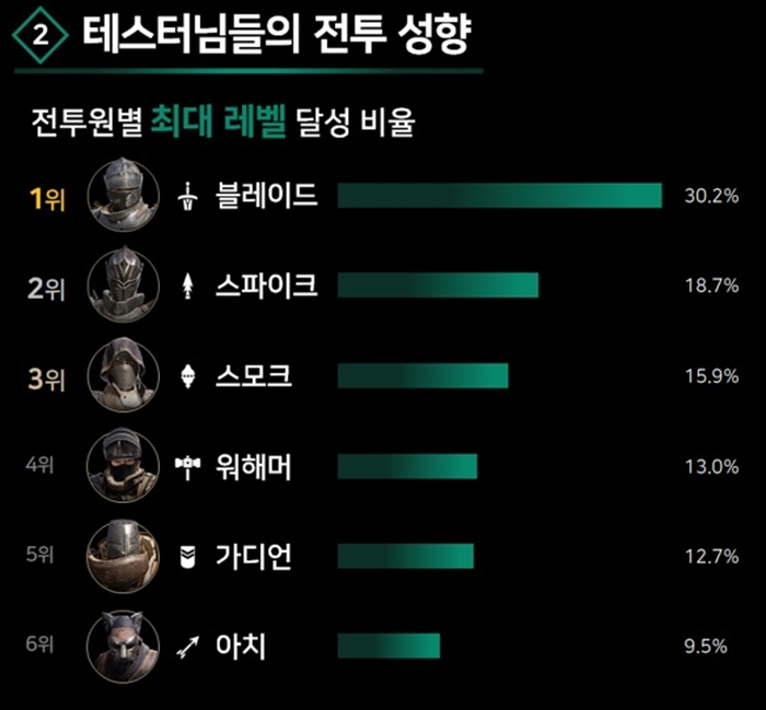 ‘블레이드(검)’, ‘스파이크(창)’, ‘스모크(향로)’ 등 6종의 캐릭터중 최대 레벨 달성 비율이 가장 높은 것은 ‘블레이드’로 나타났다. ‘블레이드’는 상대의 공격을 회피하며 쉽게 검을 휘두를 수 있어서 지속적인 플레이 동기를 이끌어낼 수 있었다. 교전 중 거리를 두고 강력한 한방을 찌르는 ‘스파이크’ 또한 최대 레벨 달성 캐릭터중 상위권에 안착했으며 후방에서 팀원들을 돕고 상대를 날려 무력화시키는 ‘스모크’가 3위를 차지했다.