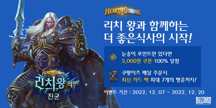 [자료제공 = 블리자드 엔터테인먼트] 리치 왕과 함께 하스스톤을 맛있게 즐기자! 블리자드 엔터테인먼트는 하스스톤(Hearthstone)의 최신 확장팩 리치 왕의 진군(March of the Lich King) 출시를 기념해 쿠팡(주)의 쿠팡이츠와 손잡고 하스스톤 플레이어들에게 카드 팩과 쿠팡이츠 할인 쿠폰 등 멋진 혜택을 제공하는 하스스톤 X 쿠팡이츠 선술집 이벤트를 펼친다. 더불어, 유명 하스스톤 인플루언서와 함께 새 확장팩의 진수를 만끽하면서 전략을 탐구할 수 있는 스트리머컵도 찾아온다.