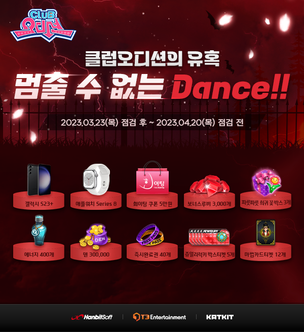 또한 클럽오디션은 4월20일 점검 전까지 6주년 포인트 이벤트를 전개한다. 유저들은 매일 출석 등 다양한 미션 달성을 통해 포인트를 모으고 이를 사용해 갤럭시 S23+, 애플워치 Series8, 회이팅 쿠폰 5만원권 등 경품에 응모하거나 쥬얼리 럭키박스티켓 등 게임 아이템으로 즉시 교환 가능하다.