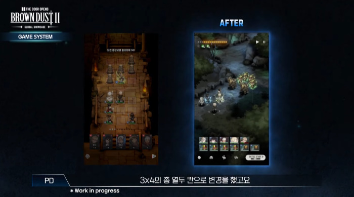 지난 1월 진행된 브라운더스트2 테스트의 피드백을 바탕으로 전투 시스템의 개선이 이뤄졌다. 타일의 수를 3x3에서 3x4의 12칸으로 변경했으며, 공격과 방어를 1턴에 모두 진행하도록 통합함에 따라 공격 턴 캐릭터 배치 시에 방어 턴까지 고려해 진형을 구성하도록 했다.