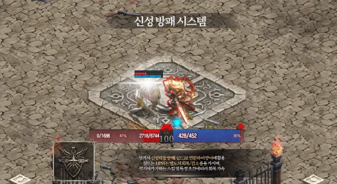 성기사의 가장 큰 특징으로는 신성 방패 시스템과 양손검과 방패의 동시 착용을 꼽을 수 있다. 신성력을 방패로 변환해 방어로 활용하는 신성 방패는 HP와는 별도의 회복 및 감소룰을 가지기에 성기사가 높은 생존력을 보유할 수 있도록 한다. 또 성기사는 양손검을 한 손에 착용하면서 방패도 동시에 장착할 수 있기에 높은 공격력과 방어력을 동시에 챙길 수 있다.