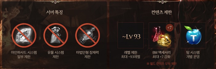 또 이용자들의 평등한 성장 환경을 구축하고자 최고 레벨 및 BM 액세서리 강화, 월드 콘텐츠, 일부 지역 PSS를 제한한다. 기존 서버와 TAM을 별도 운영한다는 점도 데몬 서버의 특징 중 하나라 할 수 있다. 즉 데모 서버는 주요 콘텐츠가 제한돼 진입 장벽이 낮은 편이며, 신규 및 복귀 이용자에게 추천해줄만한 서버다.