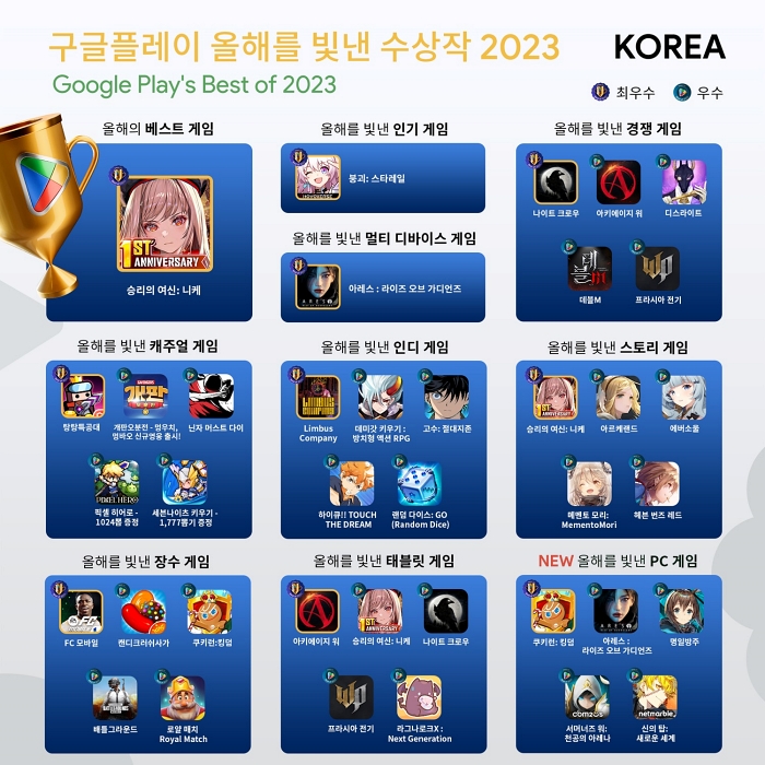 구글플레이는 매년 연말 각 나라별로 한 해 동안 가장 주목받았던 앱과 게임을 다양한 항목으로 나누어 발표한다. 수상작들은 한 해의 트렌드를 반영하는 의미있는 지표로도 활용되고 있다.