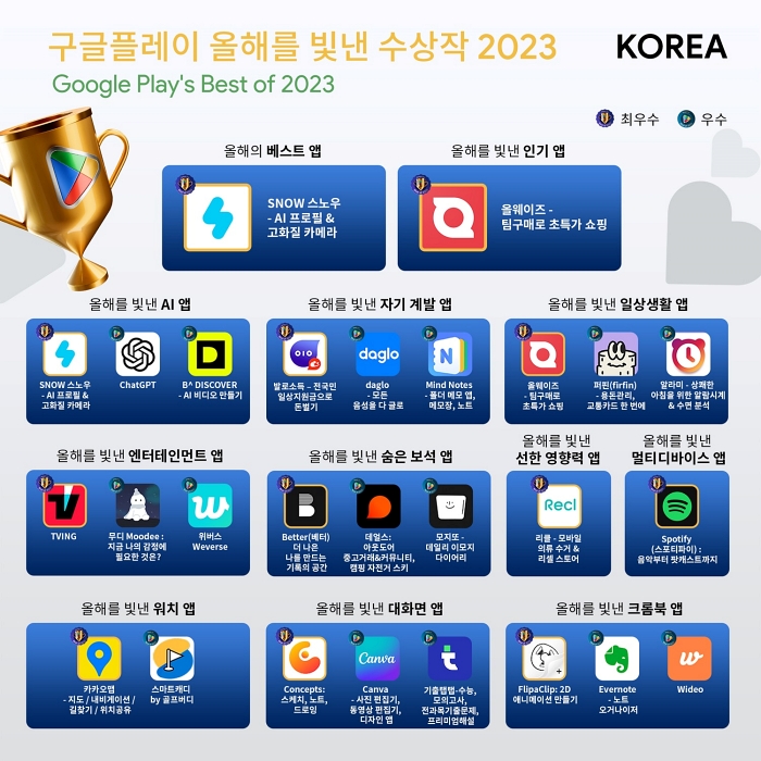 ‘올해를 빛낸 수상작 2023’ 중 올해의 베스트 앱으로 ‘SNOW 스노우’가, 올해의 베스트 게임에는 ‘승리의 여신: 니케’가 선정됐다. 이용자들이 직접 투표해 뽑은 올해를 빛낸 인기 앱과 인기 게임에는 ‘올웨이즈’와 ‘붕괴: 스타레일’이 각각 이름을 올렸다.