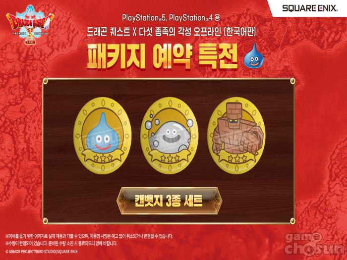 '드래곤 퀘스트 X 다섯 종족의 각성 오프라인'(한국어판)의 플레이스테이션 4/5용 패키지 버전의 예약 구매 특전으로, ‘캔뱃지 3종 세트‘를 증정한다.