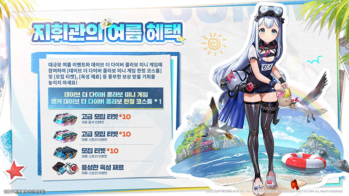 니케의 풍성한 여름 이벤트와 니케X데이브 더 다이버 컬래버레이션 특별 보상으로 고급 모집 티켓 20장, 일반 모집 티켓 10장, 각종 육성 재화는 물론 '앵커 더 다이버', '마스트 더 다이버' 코스튬을 얻을 수 있다고 하니 꼭 참여하시길 바랍니다.