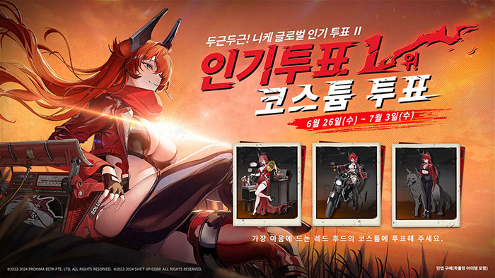 이 밖에도 인기투표 1위에 빛나는 '레드 후드'의 신규 특별 코스튬을 결정하는 투표가 6월 26일부터 7월 3일까지 진행됩니다. 득표수가 가장 높은 코스튬을 무료로 지급할 예정이오니 아낌없이 한 표를 행사해야겠습니다.