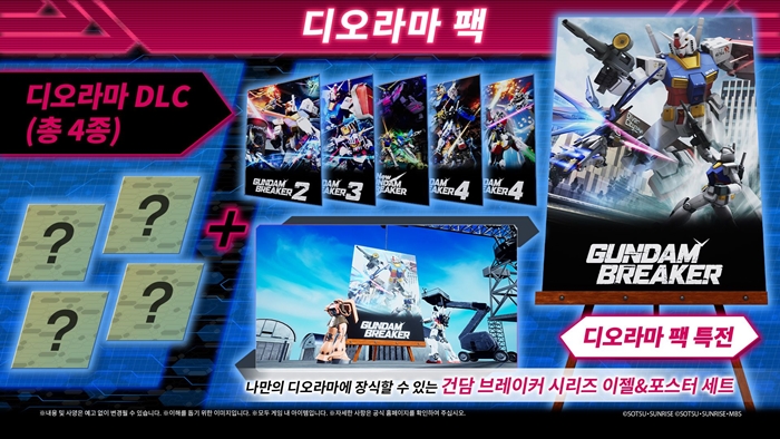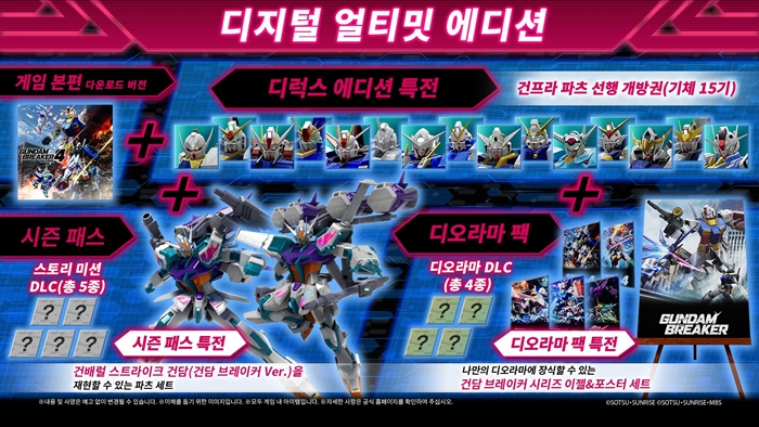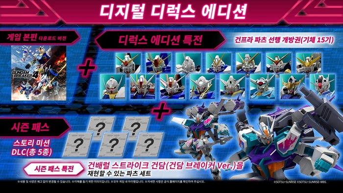 ‘건담 브레이커 4’(한국어판) PlayStation®5, PlayStation®4, STEAM®용 다운로드 버전의 예약 판매를 진행 중이다. 일반판을 비롯해 시즌 패스가 세트로 구성된 '디지털 디럭스 에디션'과 시즌 패스와 디오라마 팩이 세트로 구성된 '디지털 얼티밋 에디션'을 판매한다.
