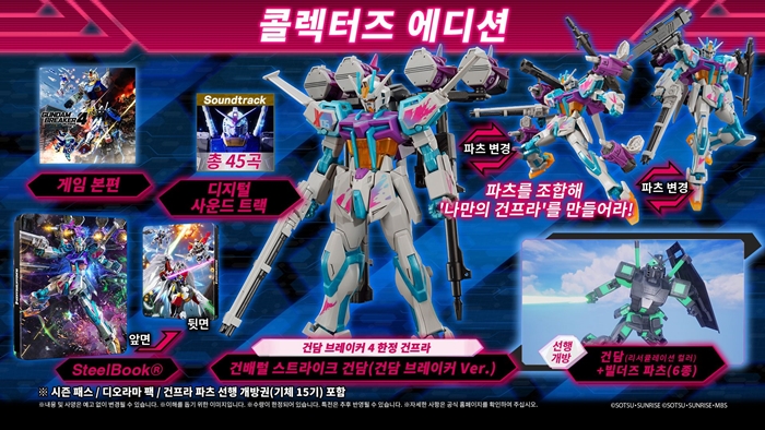 ‘건담 브레이커 4’(한국어판) 패키지 일반판과 콜렉터즈 에디션은 PlayStation®5, Nintendo Switch용으로 발매될 예정이며, 예약 판매의 일정 및 자세한 내용은 추후 공개된다.