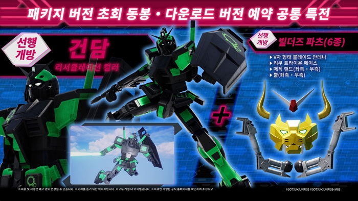 ‘건담 브레이커 4’(한국어판)의 패키지 버전 초회 동봉 및 다운로드 버전 예약 특전으로 '선행 개방 ‘건담(리서큘레이션 컬러)’ & 빌더즈 파츠(6종)'를 증정한다.
