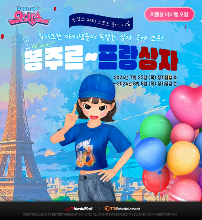 [자료제공 = 한빛소프트] 한빛소프트에서 서비스하는 PC온라인 스타일리시 리듬댄스 게임 '오디션'이 7월26일(현지시간)부터 프랑스 파리에서 열리는 스포츠 축제를 기념하고 응원하는 이벤트를 마련했다.