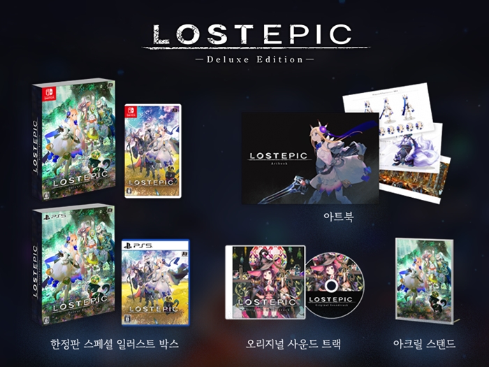 ”로스트 에픽”은 8월 8일(목), Nintendo Switch™와 PlayStation®5용 패키지 버전이 한국어화 정식 발매된다. 패키지 버전은 일반판(희망소비자가격 38,800원)과 한정판(희망소비자가격 96,800원)으로 구성되며, 한정판에는 스페셜 일러스트 박스, 아트북, 오리지널 사운드 트랙, 아크릴 스탠드가 제공된다. 또한 패키지 버전의 초회 특전으로 LOST EPIC의 메인 일러스트레이터 ‘Namie’의 일러스트로 제작된 ‘키라키라 스티커’가 동봉되어 있다.