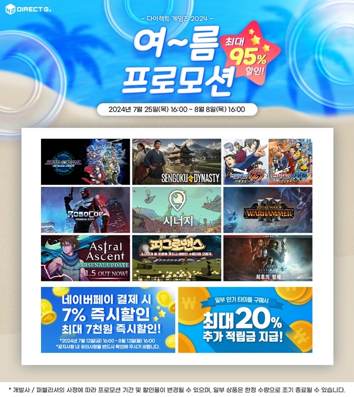 다이렉트 게임즈에서 진행되는 이번 프로모션은 8월 8일(목) 오후 4시까지 진행되며, 프로모션 기간 중에는 신작 및 인기 게임을 최대 95% 할인된 가격에 구매할 수 있다.