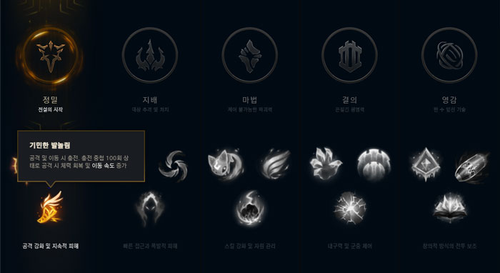 원거리 딜러 챔피언들은 지나치게 안정적으로 라인전을 풀어나갈 수 있었던 원동력인 정밀 키워드 핵심 룬 '기민한 발놀림'에 대하여 기본 회복량을 상향 조정하되 원거리 챔피언 한정으로 회복 효과를 하향했다. 그에 따라 근접 챔피언은 활용이 어려운 대신 더 높은 기대값을 가지게 된다.