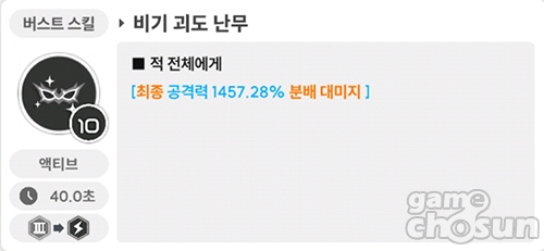 버스트 스킬 '비기 괴도 난무'는 적 전체에게 최종 공격력 1457.28% 분배 대미지를 줍니다. 역시나 버스트조차 적 전체 분배 대미지로 디자인됐습니다.