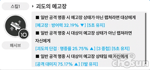 또한, 일반 공격 명중 시 대상이 예고장 상태일 때 자신에게 공격 대미지 75.17% 증가 (1발 유지) 효과를 부여합니다.