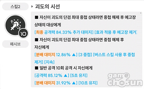 일반 공격 10회 공격 시 자신에게 공격력 85.12% 증가 (5초 유지) 효과와 분배 대미지 31.92% (10초 유지) 효과를 줍니다.