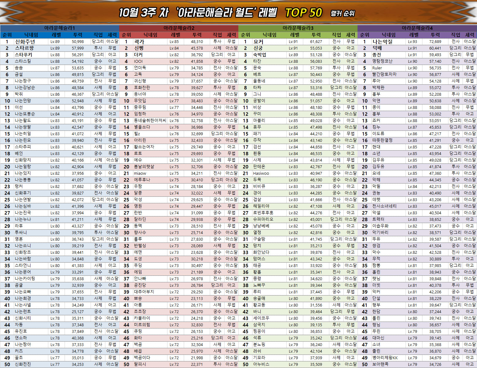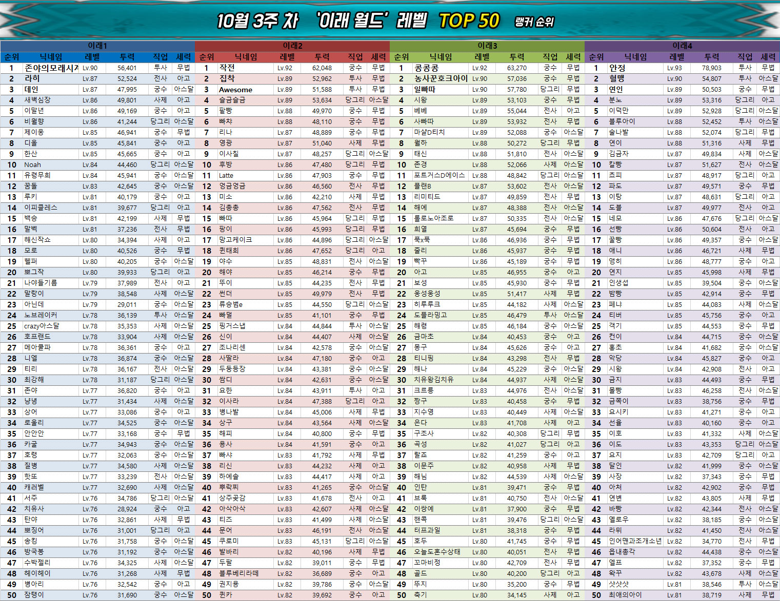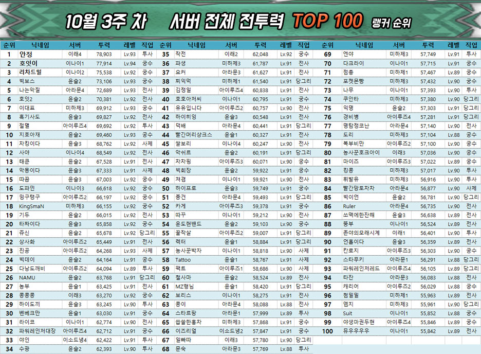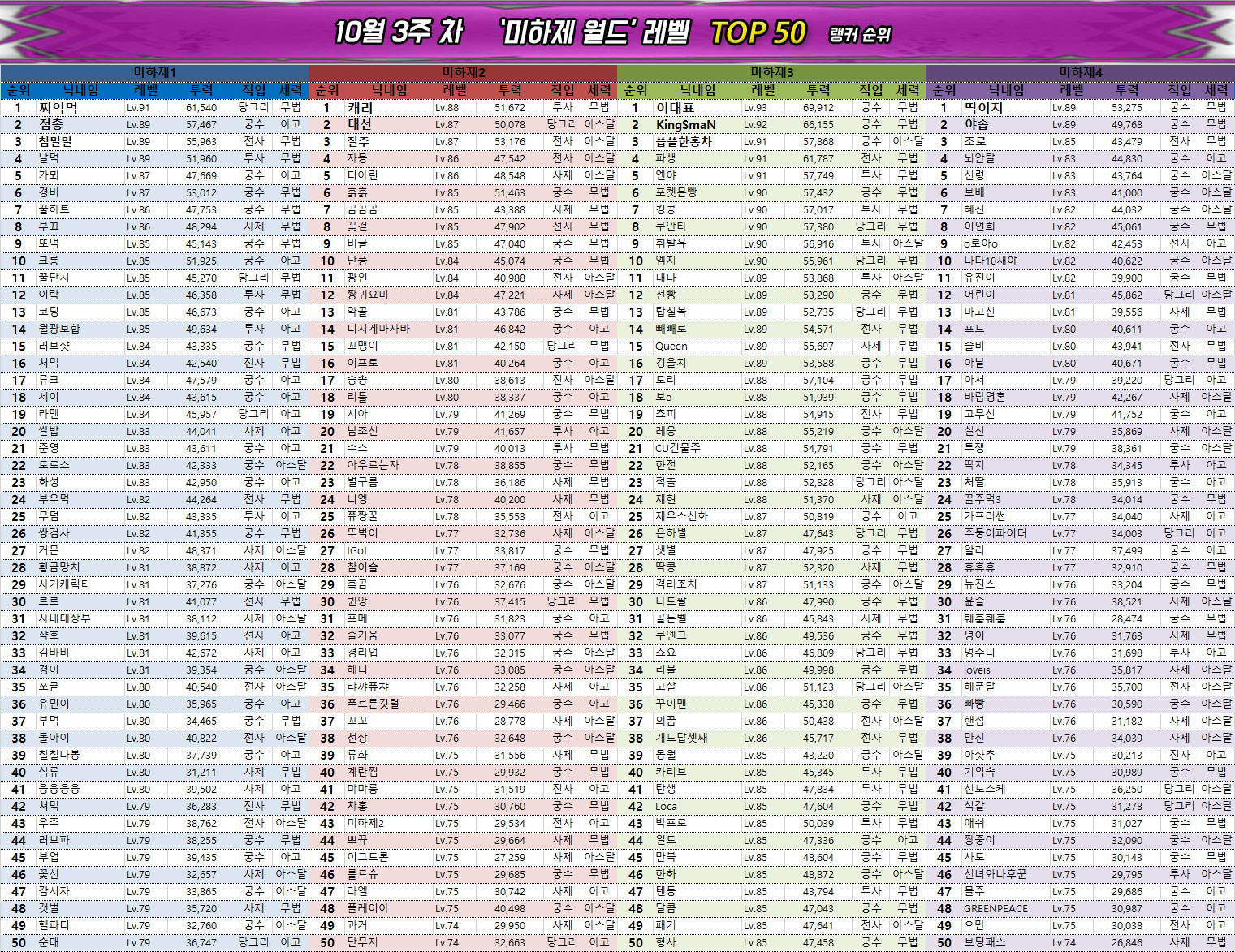 지난 주 11위에 머무르고 있었던 미하제 3서버의 이대표 유저는 급격한 전투력 상승과 함께 7위를 차지했으며 일부 서버 랭커들은 전투력이 오히려 2주차에 비해 낮게 측정되는 경우도 있었으나, 실제로는 장비 세팅을 바꾸는 과정임이 확인되었기 때문에 오차 범위 내의 이슈로 판단된다.