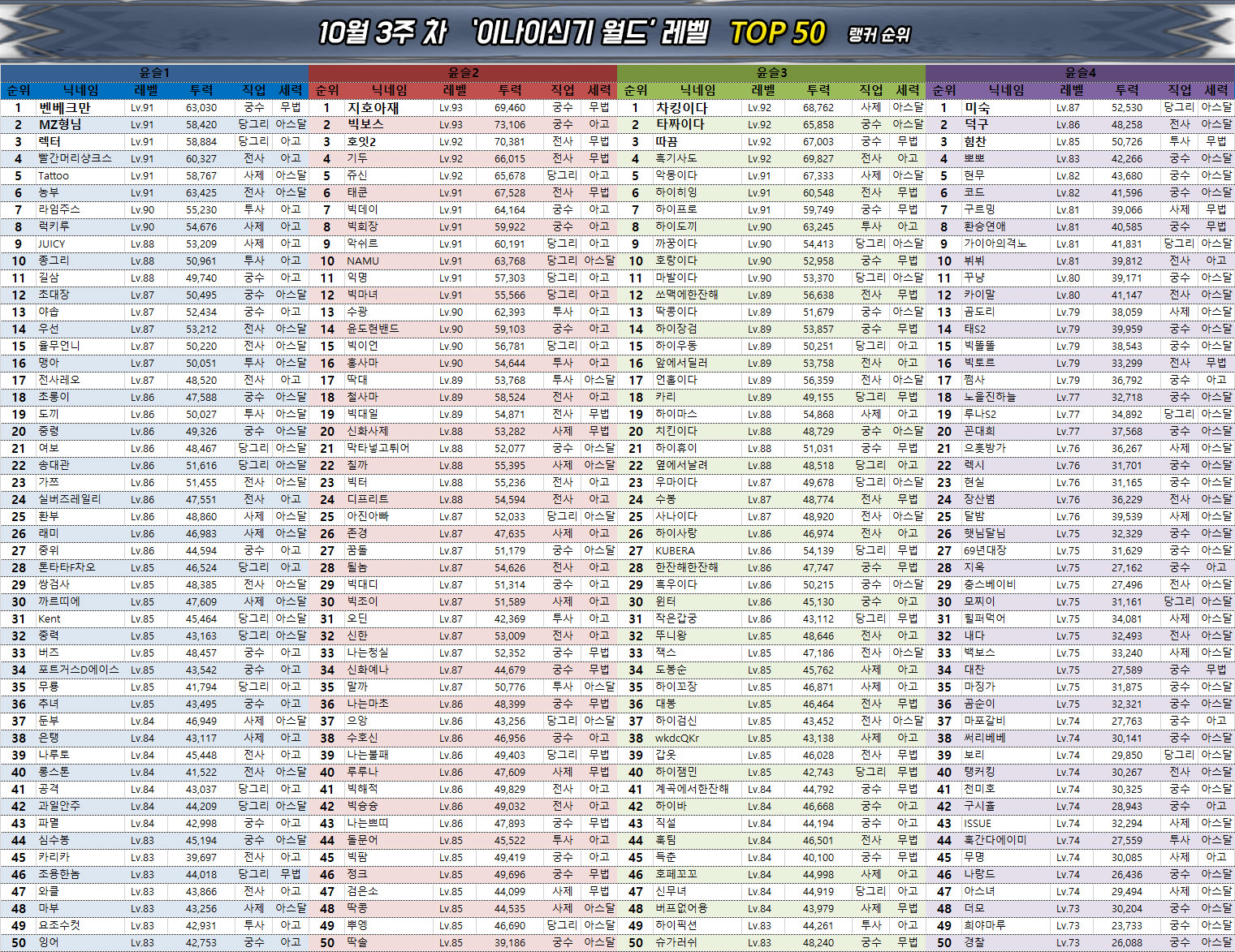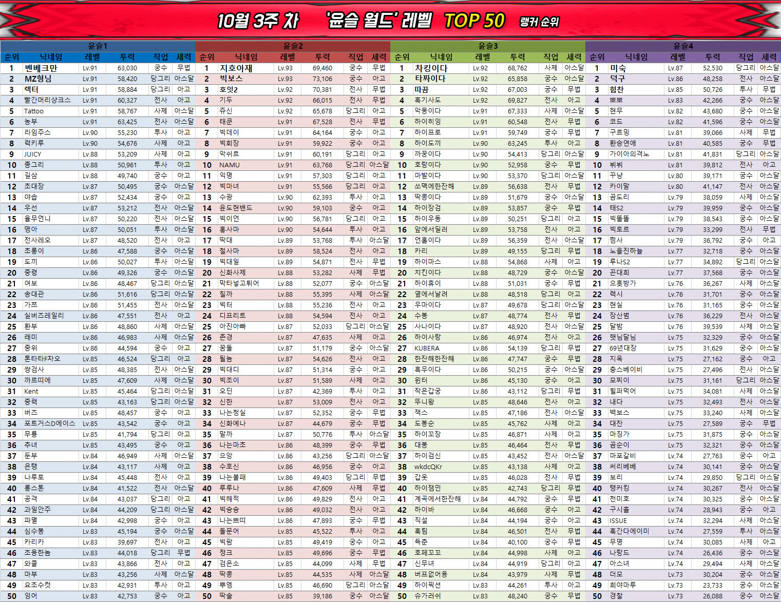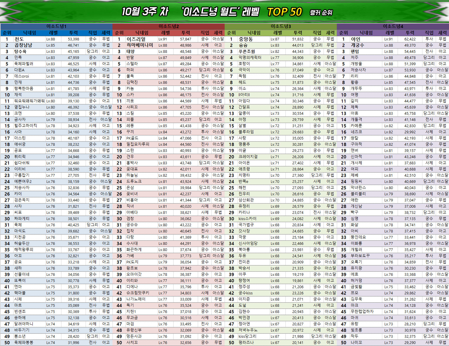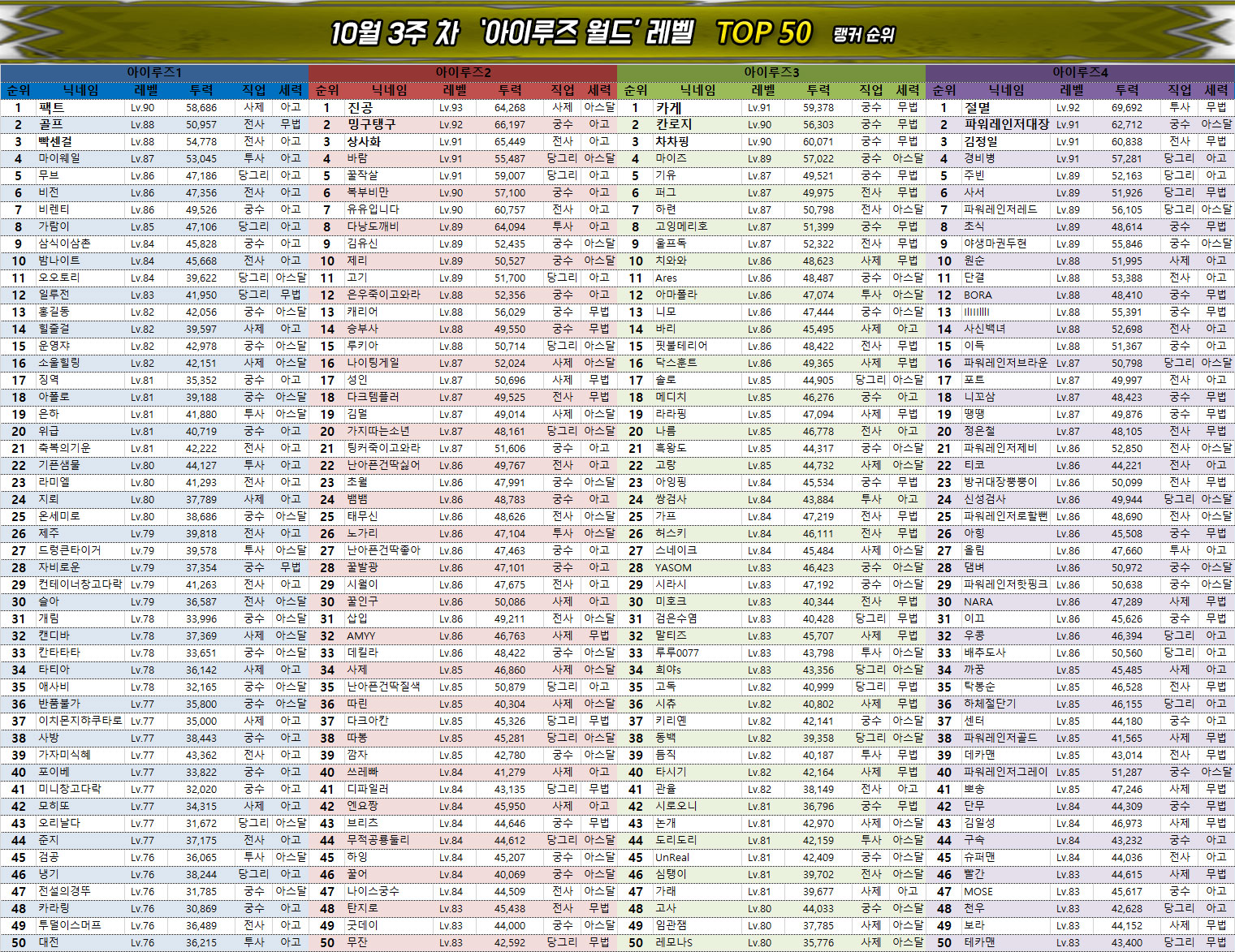 지난 주 11위에 머무르고 있었던 미하제 3서버의 이대표 유저는 급격한 전투력 상승과 함께 7위를 차지했으며 일부 서버 랭커들은 전투력이 오히려 2주차에 비해 낮게 측정되는 경우도 있었으나, 실제로는 장비 세팅을 바꾸는 과정임이 확인되었기 때문에 오차 범위 내의 이슈로 판단된다.