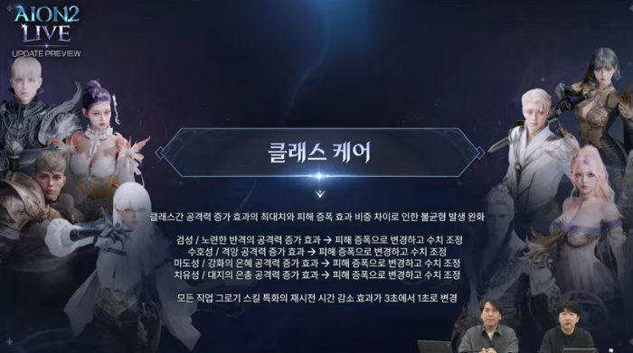 대대적인 클래스 밸런스 조정도 예고했다. 공통적으로는 공격력 증가 효과의 최대치가 100%인 점을 개선하기 위해 검성, 수호성, 마도성, 치유성 등의 공격력 증가 효과를 피해 증폭 효과로 변경한다. 그로기 스킬 특화 중 재시전 시간 3초 감소 효과를 1초로 변경한다.