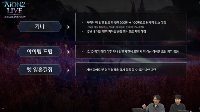 이에 따라 캐릭터가 필드에서 획득할 수 있는 1일 키나 획득 제한량을 200만을 100만으로 감소시킬 예정이다. 로그 조사 결과 일일 50만 이상의 키나를 획득하는 캐릭터 비중은 전체의 5% 이하인 것으로 나타났다. 그는 "100만 키나로 줄인 후 모니터링하고, 추가 조치가 필요하다고 판단되면 50만으로 줄일 예정"이라고 설명했다.