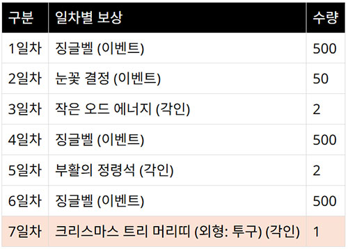 주요 보상으로 새롭게 오픈되는 '징글벨 페스티벌 상점' 이용 재화인 '징글벨 (이벤트)'과 '작은 오드 에너지', '부활의 정령석' 등을 얻을 수 있으며, 마지막 7일차에는 '크리스마스 트리 머리띠 (외형 :투구, 각인)이 지급됩니다.