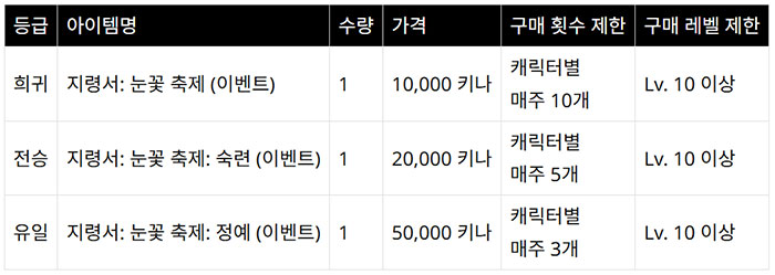 NPC 상인은 등급별 '지령서: 눈꽃 축제 (이벤트)'를 각각 키나로 판매하고, 해당 지령서 미션 달성 시 '루돌프의 선물 상자' 물질 변환 재료 '눈꽃 결정 (이벤트)'를 보상으로 얻을 수 있습니다. 각 지령서는 등급에 따라 매주 구매 제한이 있습니다.