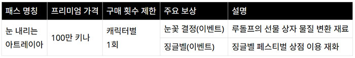 10일 정기점검 후부터 12월 31일 정기점검 전까지 이벤트 데바 패스 '눈 내리는 아트레이아'가 오픈됩니다.