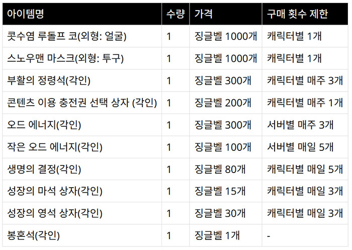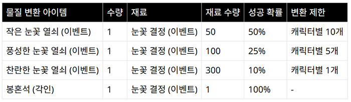 또, '눈꽃 열쇠 조각'으로 만들 수 있는 '눈꽃 열쇠' 물질 변환식 3종과 '봉혼석 (각인) 물질 변환식이 추가됩니다. '눈꽃 열쇠' 변환을 통해 성공 확률에 따라 '눈꽃 결정 (이벤트)'를 얻을 수 있으며 각 변환식은 캐릭터별 변환 제한이 있습니다. '봉혼석 (각인)' 물질 변환식은 100% 성공하고, 변환 제한이 없습니다.