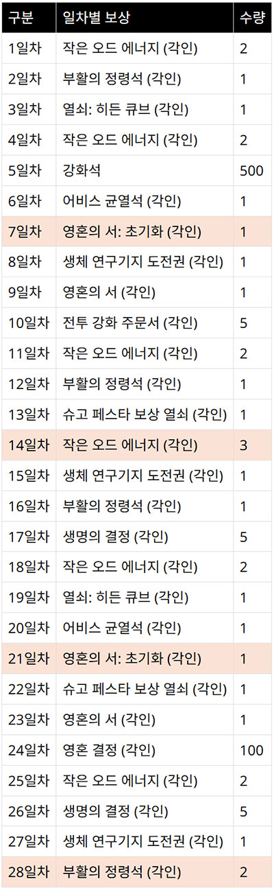 '오드 에너지', '부활의 정령석', '열쇠: 히든 큐브', '강화석' 등 유용한 소모품을 포함해 7일차, 14일차, 21일차, 28일차에는 '영혼의 서: 초기화(각인)' 아이템을 비롯한 더 좋은 보상을 지급합니다.