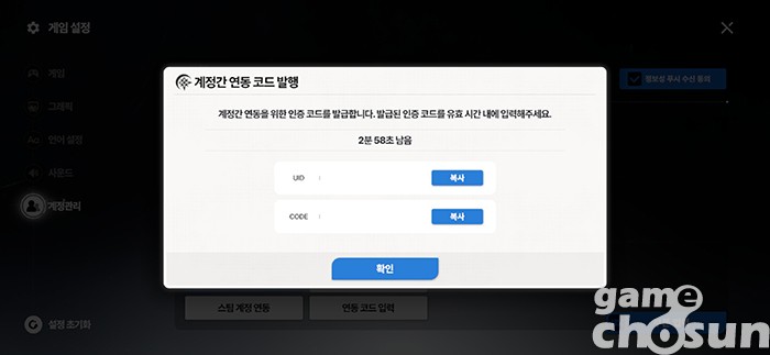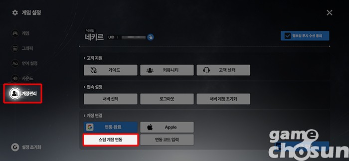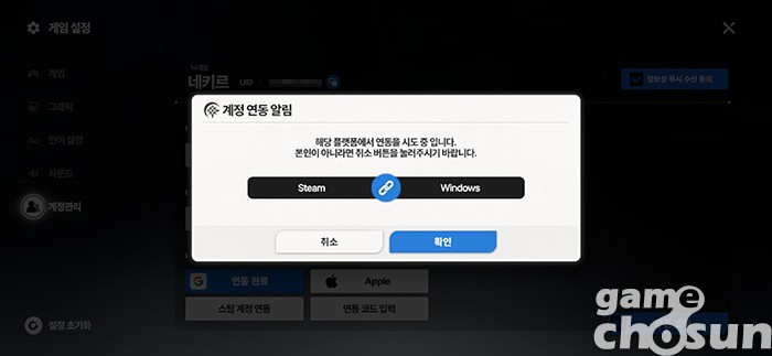 기본 계정으로 스팀 버전에 접속하려면 스팀 버전 시작 화면에서 꼭 연동을 해줘야 한다. 연동은 기존 계정 설정에서 UID와 연동 코드를 발급받아 진행할 수 있다.
