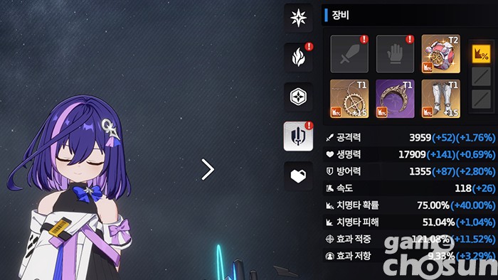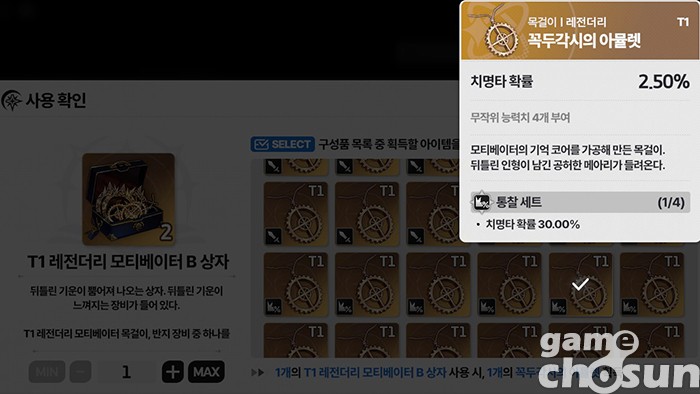 장비에선 통찰 세트와 목걸이 무작위 주 능력치, 모든 장비 무작위 보조 능력치에서 치명타 확률을 챙길 수 있다. 목걸이 주 능력치에서 얻을 수 있는 치명타 확률은 T1 15강 기준 10%로 여기까지 합하면 75%의 치명타를 얻을 수 있다.