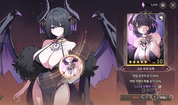 카드의 액티브 스킬 '고혹'은 팀 전체의 공격력을 올려주는 효과로, 좋기로 소문난 '멀린' 카드와 동급이죠.