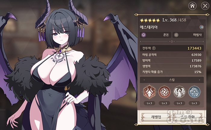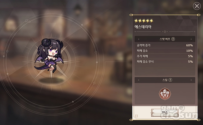 먼저 신규 캐릭터 '에스테리아'입니다. '혼돈' 속성의 '후열', '마법사'로 갓 출시된 따끈따끈한 캐릭터라 정확한 조합이나 쓰임새는 연구 중에 있습니다만, 당장은 '공포'라는 인기 상태 이상 유발 스킬을 가진 마법사 덱의 든든한 서포터로 여겨지고 있습니다.