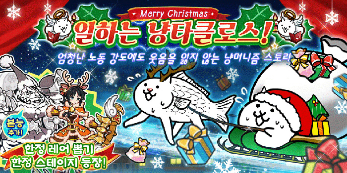 [자료제공 = 포노스] 주식회사 포노스(대표 츠지코 요리카츠)는 타워디펜스 게임을 대표하는 '냥코대전쟁'에서 12월 15일부터 기간 한정 이벤트 ‘일하는 냥타클로스!’를 개최한다고 밝혔다.