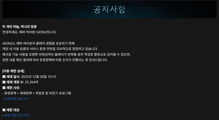 아이온2는 12월 30일까지 43차에 걸쳐 작업장 및 비인가 프로그램 이용 등 게임 운영 방해 계정에 대한 제재 조치를 진행했다. 제재가 이뤄진 계정 수는 305,116개 달하며, 캐릭터 수로 따지면 120만 개 이상일 것으로 추산된다. 17일 업데이트에서 매크로 신고 기능이 추가되면서 운영팀 모니터링의 사각지대를 보완했으며, 이에 따라 제재가 가해지는 계정 수가 훨씬 증가했다.
