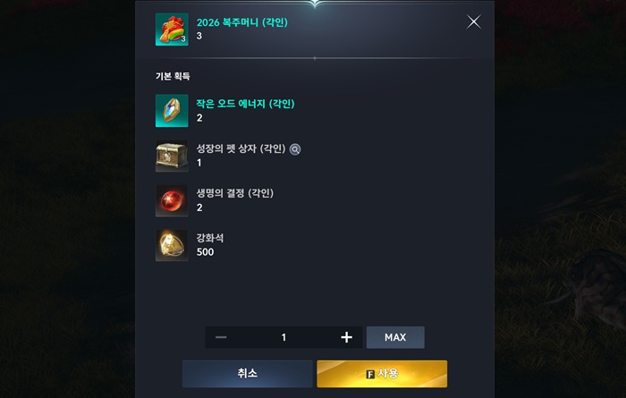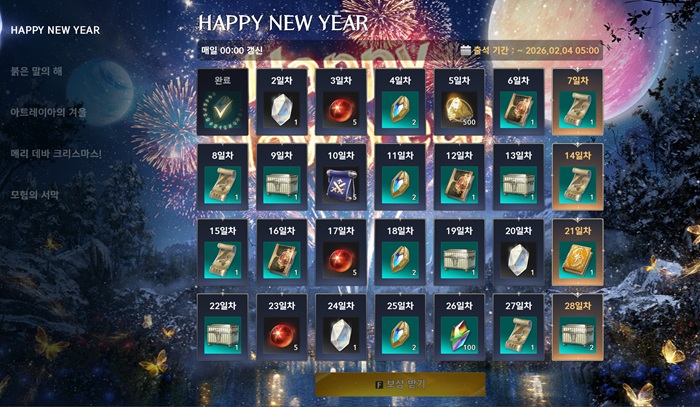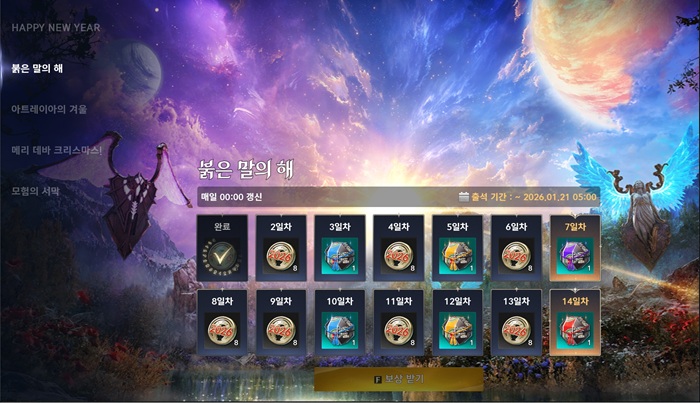 2026년의 첫 날인 1월 1일에는 모든 이용자에게 우편함을 통해 '2026 황금 복주머니'를 선물한다. 해당 아이템을 개봉할 경우, 외형 상자와 오드 에너지, 원정 및 초월 도전권 선택 상자, 부활의 정령석, 이벤트 음식 아이템, 신년 복주머니 및 해피 뉴 이어 외형 아이템, 외형 변경권, 격돌의 룬 상자, 영혼의 서: 초기화 등을 얻을 수 있다.