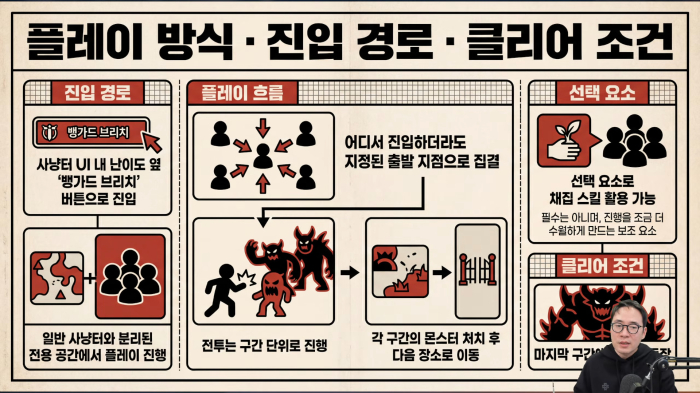 뱅가드 브리치는 사냥터 주간 협동 콘텐츠다. 사냥터 UI에서 뱅가드 브리치 버튼으로 진입하며, 전용 공간에서 구간별로 몬스터를 처치해 마지막 구간 보스를 처치하는 식으로 진행하게 된다. 선택 요소로 채집 스킬을 활용해 좀 더 수월한 진행을 꾀할 수 있다.