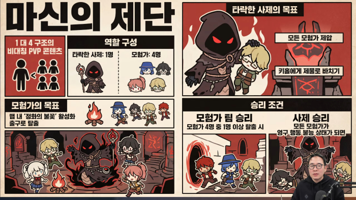 마신의 제단은 1:4 비대칭 PvP 콘텐츠다. 게이머 5명 중 1명은 타락한 사제, 4명을 모험가가 되어 대결을 한다. 타락한 사제는 모든 모험가를 키홀에게 제물로 바쳐야 하며, 모험가들은 정화의 불꽃을 활성화해 출구로 탈출해야 한다.