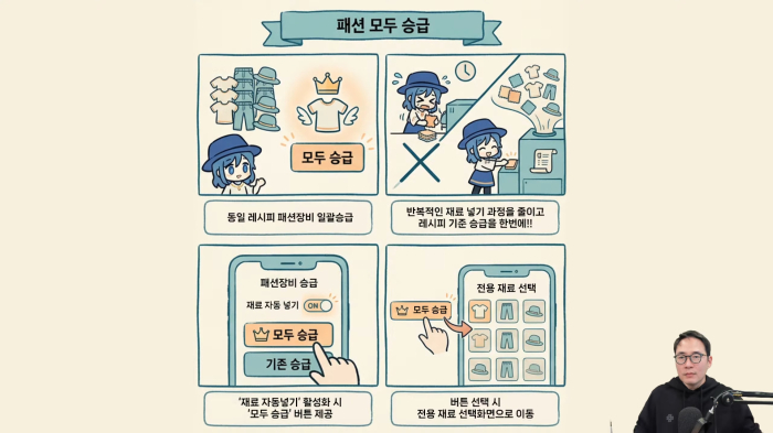 편의성 기능으론 패션 장비 일괄 기능이 추가된다. 재료 자동 넣기 활성화 후 모두 승급 버튼이 제공된다. 사용 가능한 재료 중 추천 선택과 전체 선택, 직접 선택 등 원하는 재료를 선택해 보유 재화 내에서 가능한 만큼 승급이 진행된다.